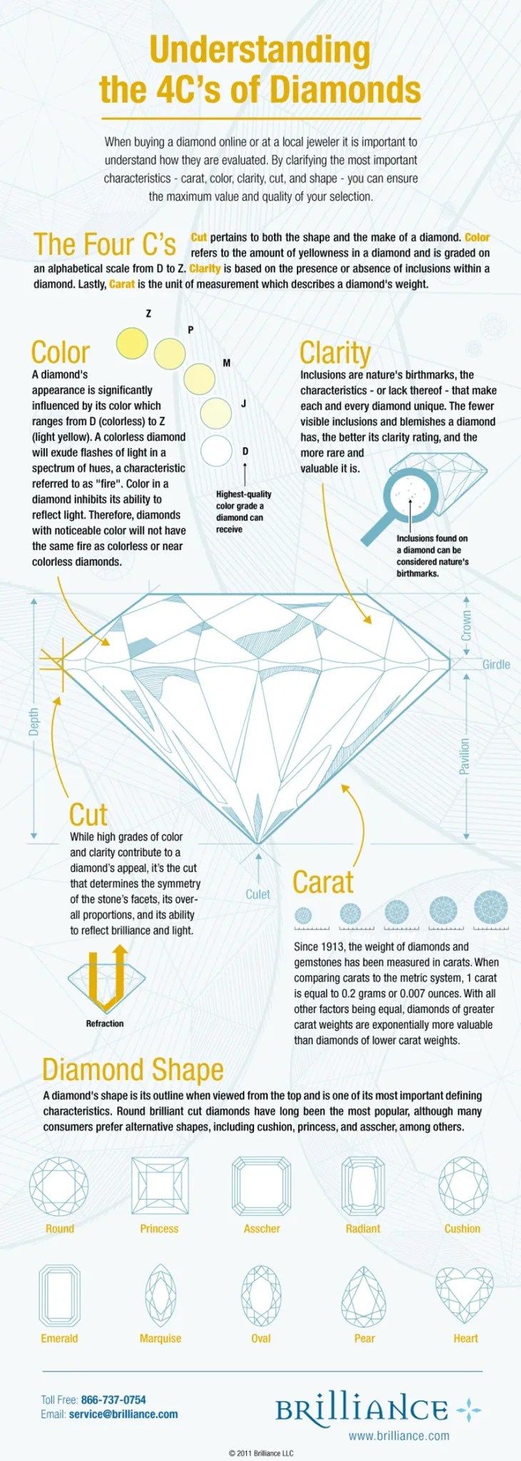 When buying diamonds and diamond-studded jewelries, it is important to know how to determine its value before making a purchase. It would be a waste to pay a huge amount of money for something that is not worth spending on. Additionally, the sad truth is that there are several people out there who are willing to take advantage of people who have no knowledge of diamonds for personal gain. In order to avoid this unfortunate incident from happening, it would be best to learn more about these precious stones before going to a jewelry shop. Brilliance.com made this infographic about understanding the four C’s of diamonds which include the Color, Clarity, Cut and Carat. These four factors are what decide how expensive a diamond may be sold in the market. This visual aid contains a full detail explanation of the four C’s and a diagram to make understanding each aspect easily.